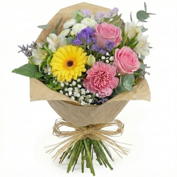 • skład: żółte gerbery, różowe róże, różowe goździki, białe alstromerie i fioletowe akcenty (zatrwian), gałązki eukaliptusa i gipsówki