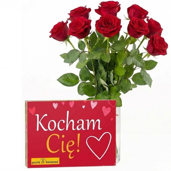 • skład: 9 czerwonych róż, długość róż: 50 cm, bombonierka "Kocham Cię" (180 g)